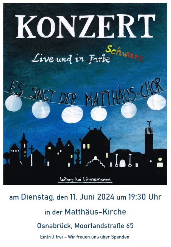 Der Matthäuschor unter der Leitung von Kai Lünnemann singt am Dienstag, 11. Juni um 19:30 Uhr in der Matthäuskirche. Herzlich willkommen!