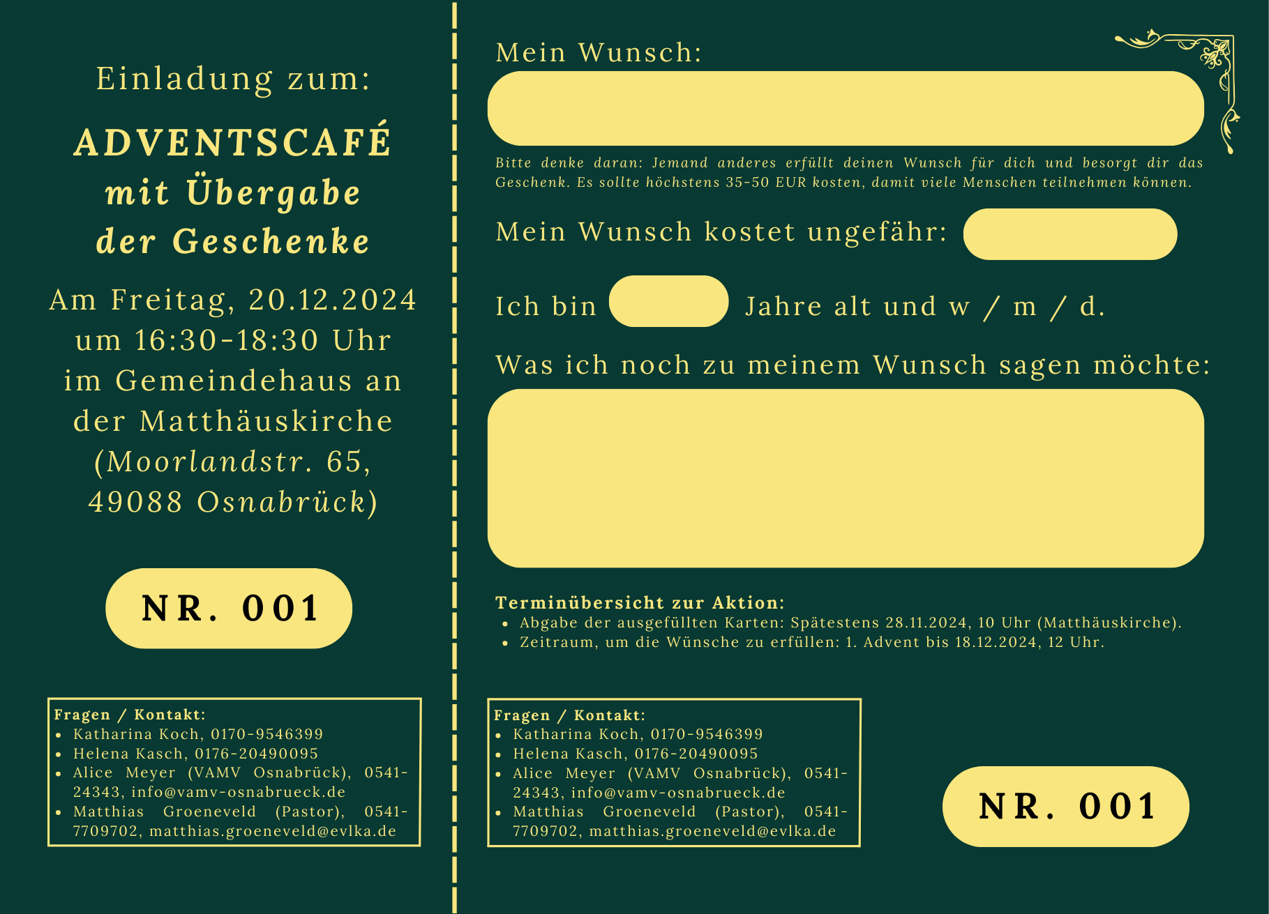 Die Aktion wird von Katharina Koch, Helena Kasch sowie Alice Meyer vom VAMV Osnabrück (Verband alleinerziehender Mütter und Väter) und Pastor Matthias Groeneveld (Gesamtkirchengemeinde An der Nette) organisiert und richtet sich an Kinder, deren Eltern in Einelternfamilien leben. Um teilzunehmen, tragen die Kinder ihre Weihnachtswünsche auf speziellen Karten ein, die sie bei den Organisatoren der Aktion erhalten. Ihre Karten können sie dann persönlich bei den Ansprechpartner*innen oder im Büro an der Matthäuskirche (Moorlandstr. 63) abgeben.