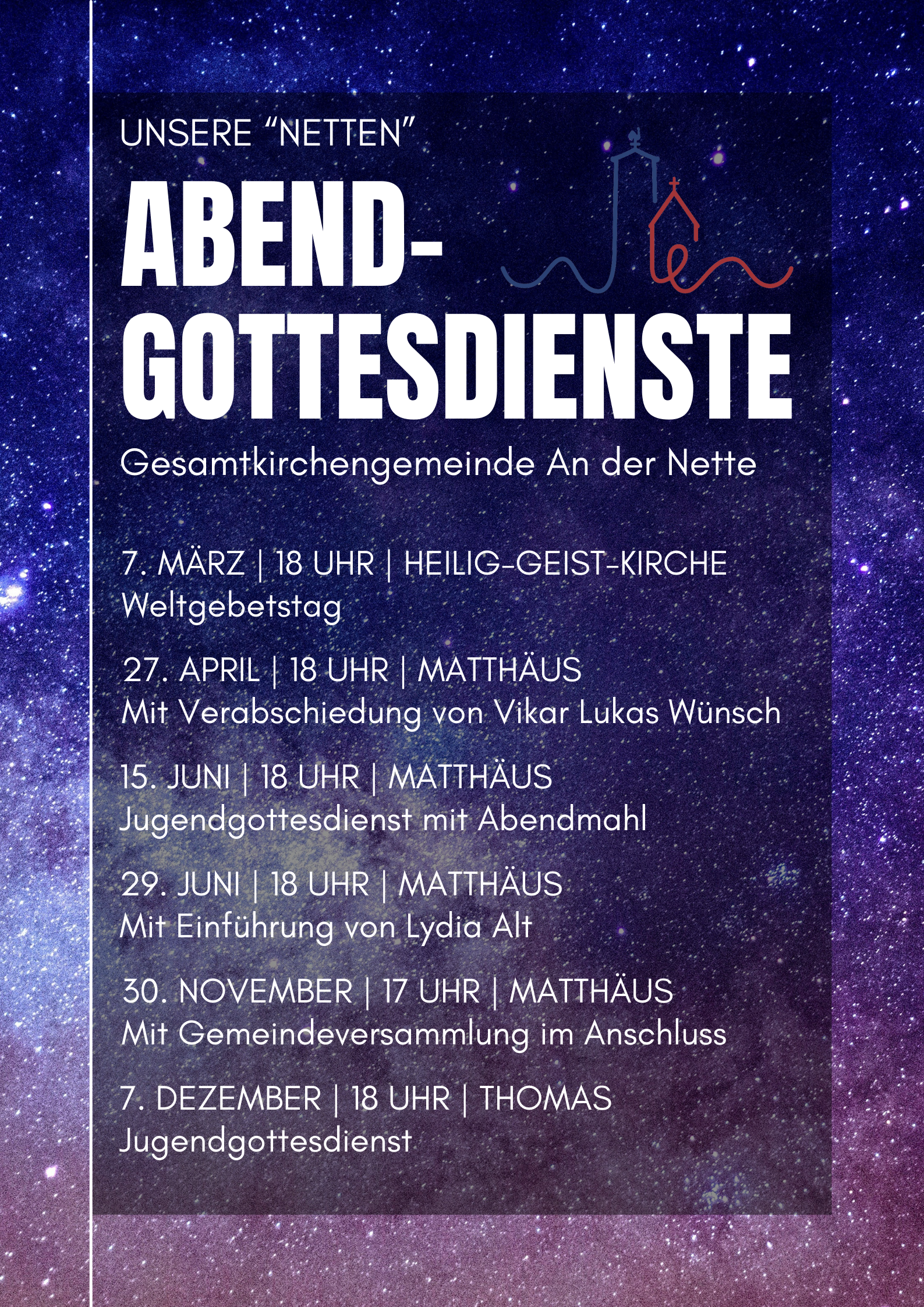 - am 27.04.2025 um 18.00 Uhr Gottesdienst in Matthäus. Vikar Lukas Wünsch wird verabschiedet. Es singt der Matthäuschor, Pastor Groeneveld.