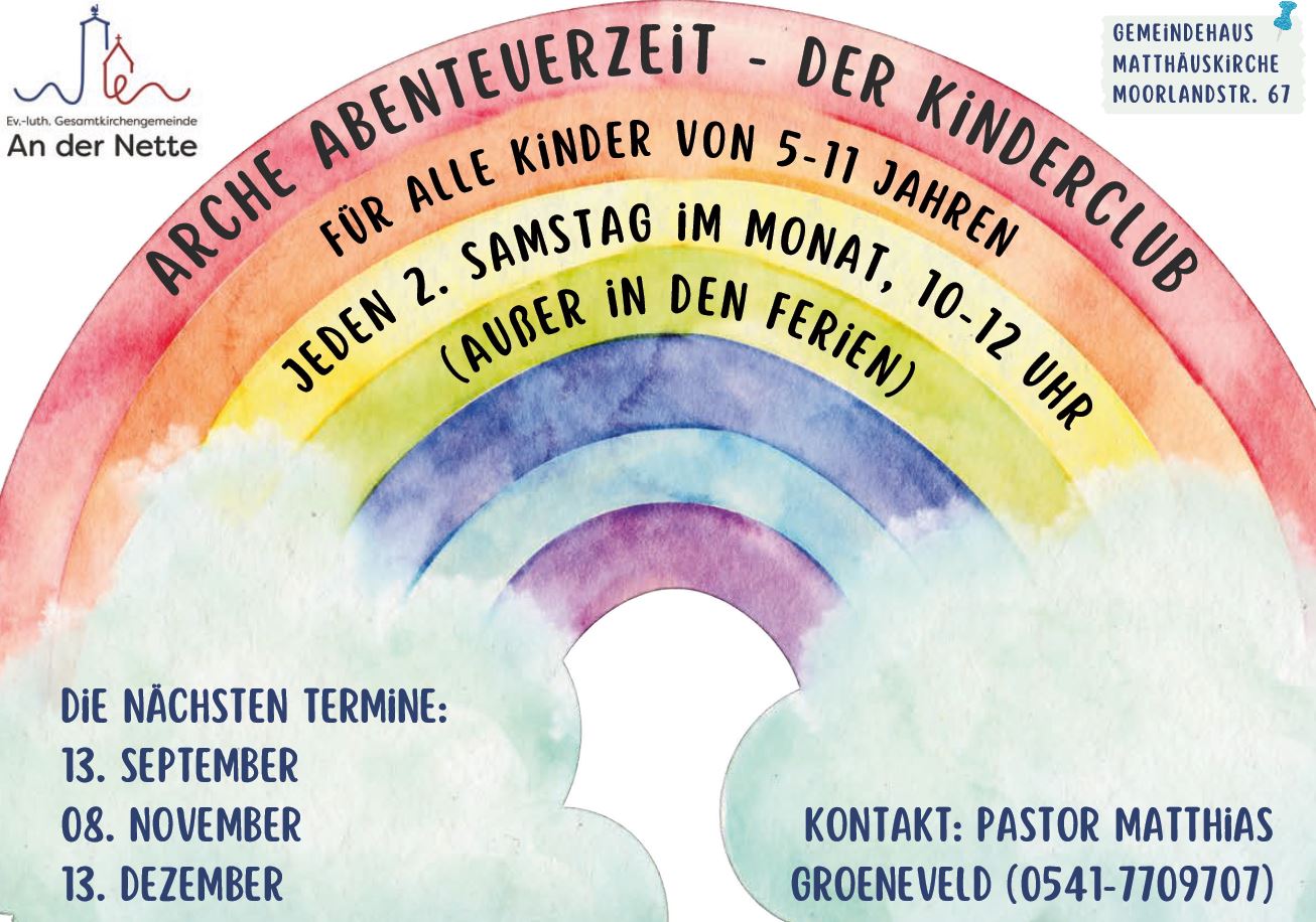 „Moin liebe Kinder, am Samstag ist es wieder so weit: Es ist der 2. Samstag im Monat und damit Zeit für „Arche Abenteuerzeit“, der Kinderclub im Gemeindehaus an der Matthäuskirche. Für Kinder im Alter von 5-11 Jahren gibt es in der Zeit von 10-12 Uhr gute Geschichten, tolle Aktionen und eine Menge Spaß. Kommt gerne vorbei!