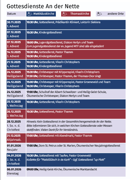 Nun gilt der Advent ja eigentlich als Zeit der Vorbereitung, sogar des Fastens... davon sind wir irgendwie ziemlich entfernt - bei all dem, was in unserem Stadtteil ökumenisch und bei uns in der Gemeinde an adventlicher Musik, Bastelaktionen und Weihnachtsfeiern los ist. Und gleichzeitig kann genau so ein Gottesdienst, ein Lebendiger Adventskalender, ein Konzert für genau den Moment des Innehaltens sorgen, den wir grade brauchen. Im Blickkontakt werdet ihr fündig.