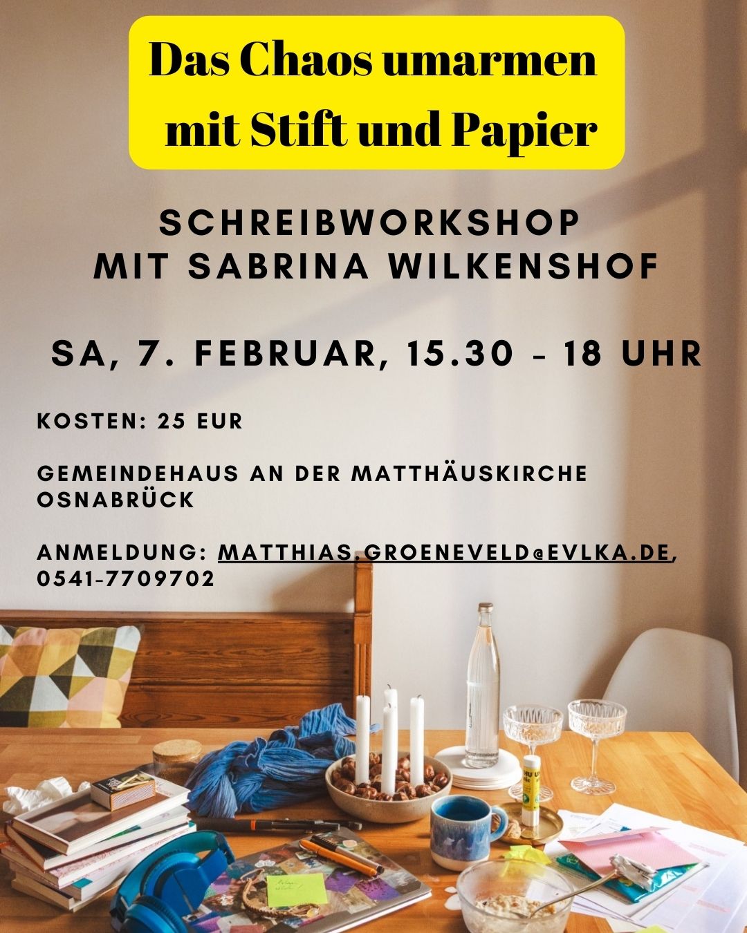 Bereits am Nachmittag desselben Tages gibt es außerdem die Möglichkeit, an einem Workshop in Form einer Schreibwerkstatt mit Sabrina Wilkenshof teilzunehmen. Der Workshop lädt dazu ein, eigene Gedanken, Texte und spirituelle Impulse schreibend zu erkunden. Die Teilnahmegebühr beträgt 25 Euro. Der Workshop beginnt um 15:30 Uhr und dauert 2,5 Stunden inkl. Pause. Um eine verbindliche Anmeldung wird gebeten.