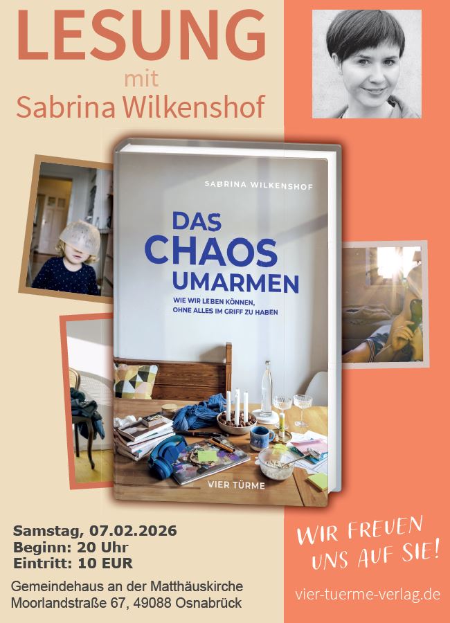 Am Samstag, 7. Februar 2026, ist die Autorin und Theologin Sabrina Wilkenshof zu Gast im Gemeindehaus an der Matthäuskirche in Osnabrück. Um 20 Uhr liest sie aus ihrem neuen Buch „Das Chaos umarmen – Wie wir leben können, ohne alles im Griff zu haben“, das im Januar 2026 im Vier-Türme-Verlag erscheint.