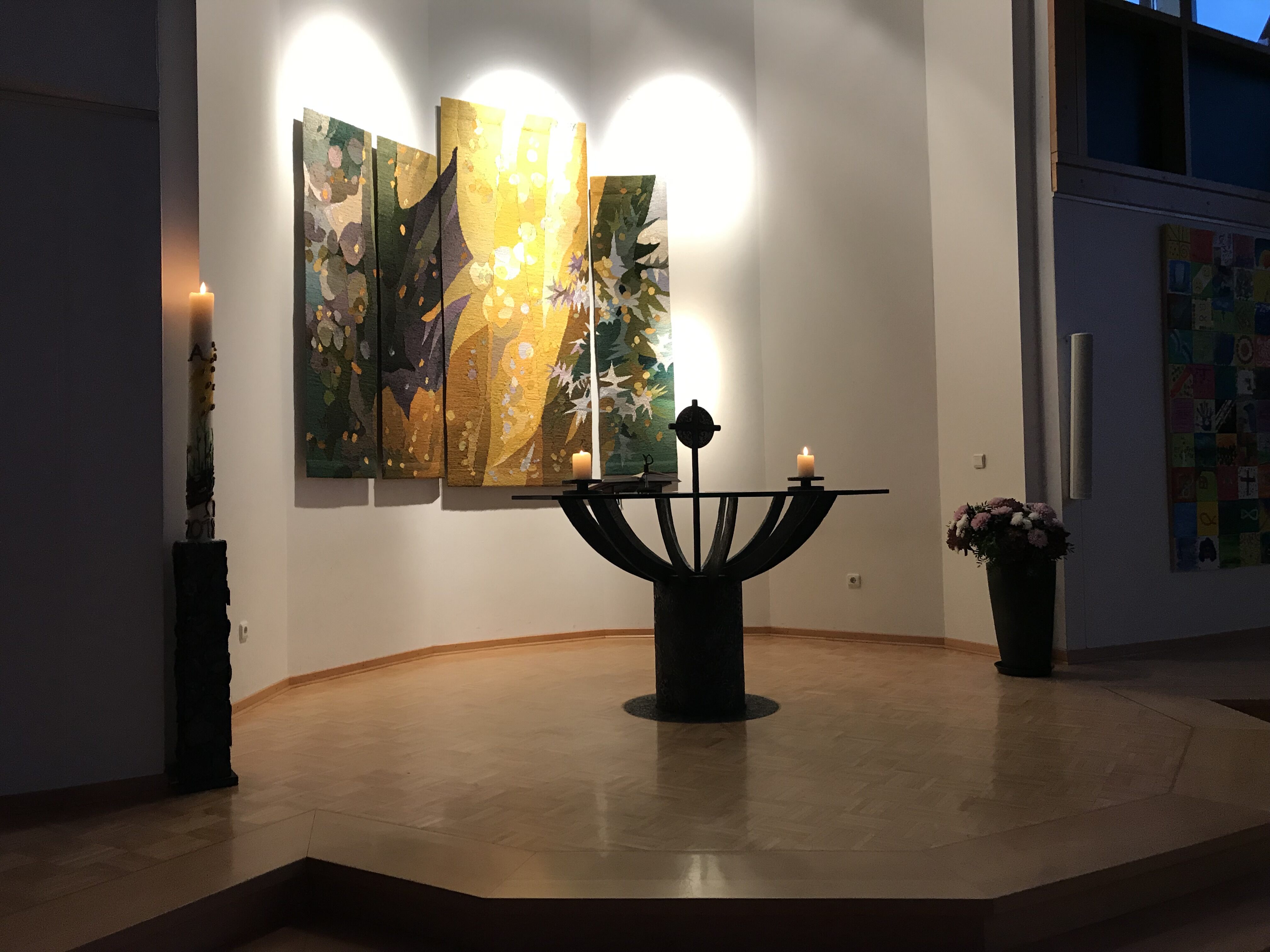Vier große, handgewebte Wandteppiche, Tapisserien genannt, zieren den Altarraum. Sie erinnern die Gemeinde an wichtige Besonderheiten in den Kirchenjahreszeiten: